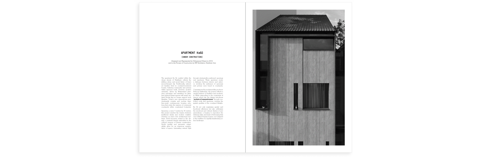 The apartment Ka 02, nestled within the dense streets of Mashhad, reflects the shifting urban and social fabric of Iran’s second-largest city. Traditionally, extended families lived in courtyard-centered houses, fostering community and privacy within spacious voids. However, modern urbanism, driven by Westernized planning principles and shrinking lot sizes, has replaced these spaces with small, isolated blocks that no longer support such lifestyles. Today’s new generations predominantly couples and nuclear families seek contemporary housing solutions that retain the essence of communal courtyards within constrained footprints.